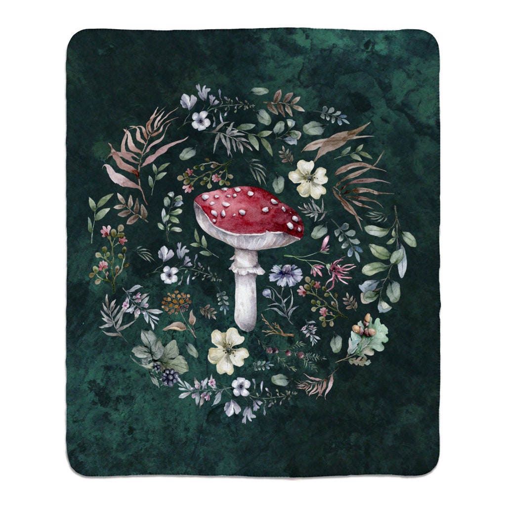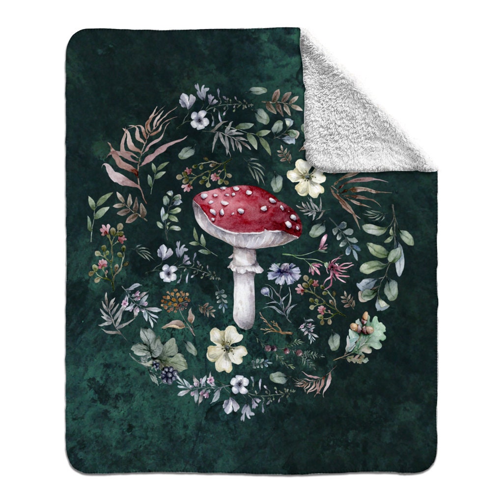 Botanical Mushroom Fleece Sherpa Blanket | Floral Decorative Throw | Cozy Home Decor Gift | Cottage Core Decor